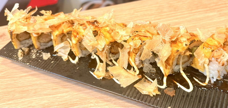 Crevette tempura, concombre, cheddar flambé, mayo, sauce okonomi, bonite séchée.